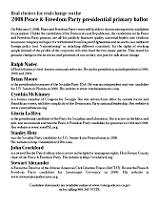 This is an updated version of the flyer on the presidential candidates who are on the February 5th primary ballot, correcting some minor errors in the website listings on the January 19th version and the candidate descriptions in the version that was distributed at the forum held January 12th in San Francisco. To print it, download the PDF version, which prints on a single 8.5 by 11 inch sheet of paper.